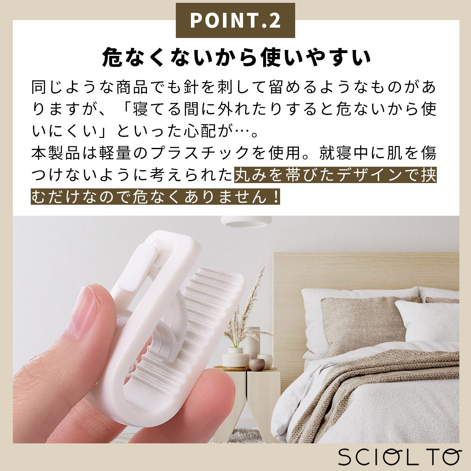 同じような商品でも針を刺して留めるようなものがありますが、「寝てる間に外れたりすると危ないから使いにくい」といった心配が。本製品は軽量のプラスチックを使用。就寝中に肌を傷つけないように考えられた丸みを帯びたデザインで挟むだけなので危なくありません。