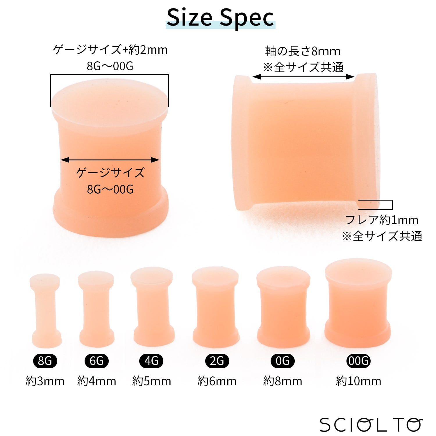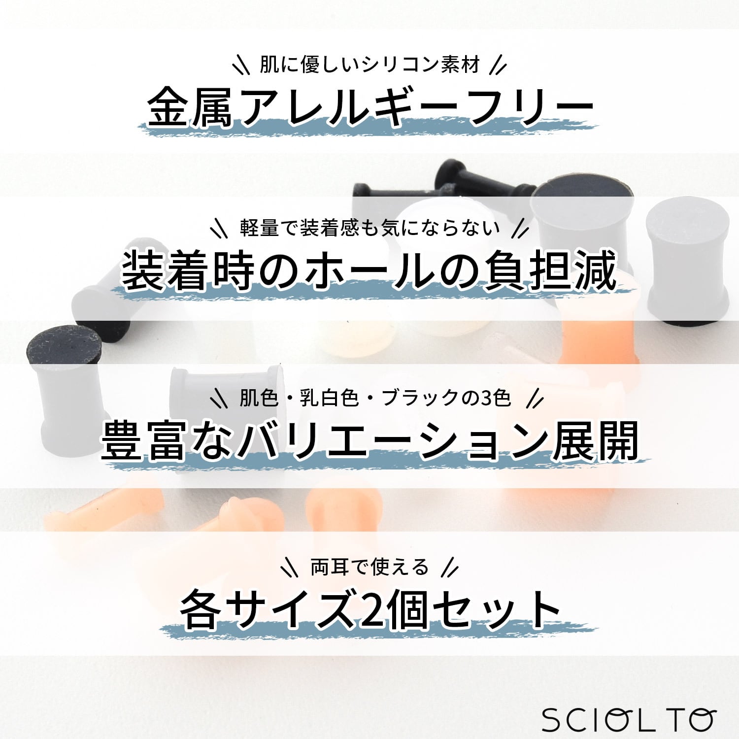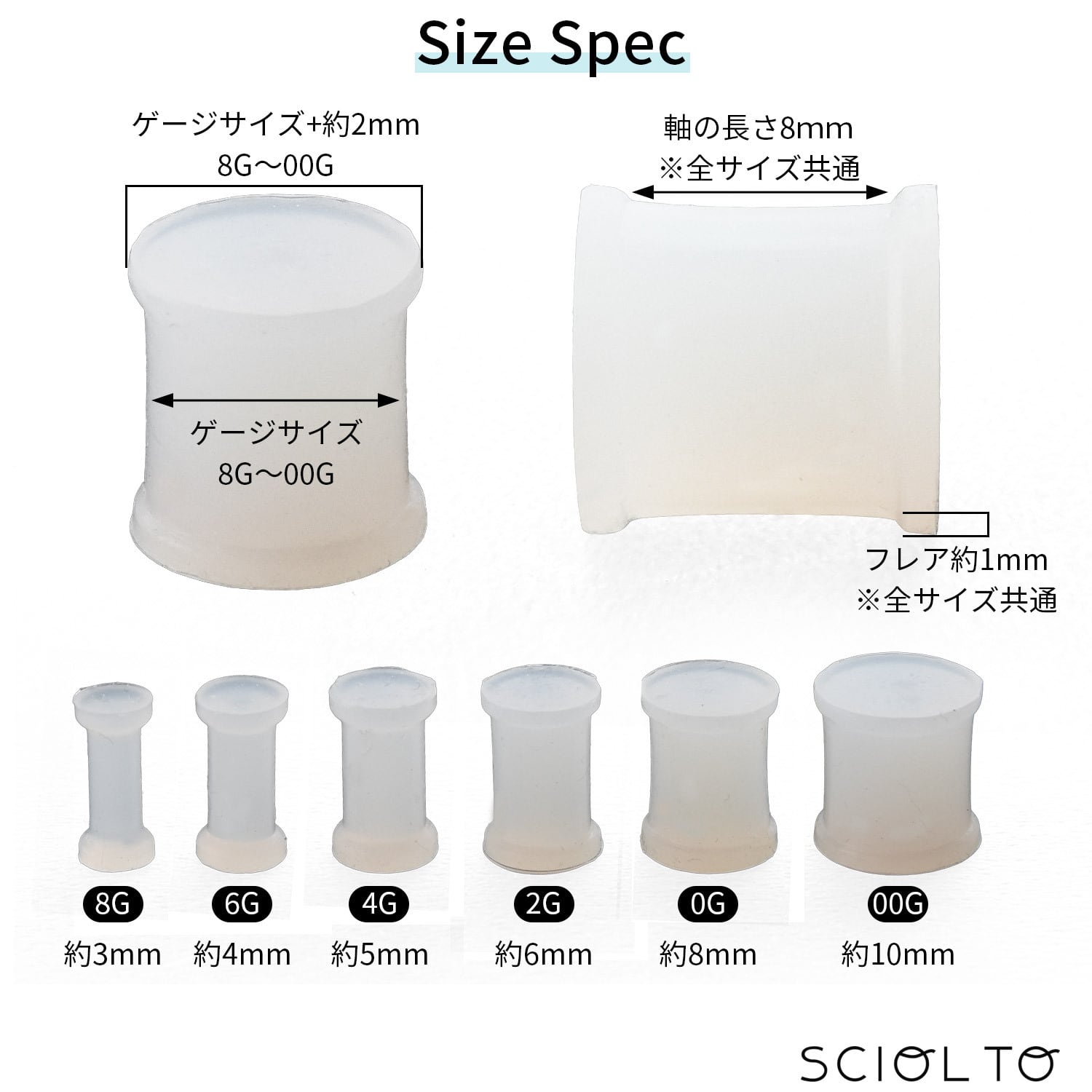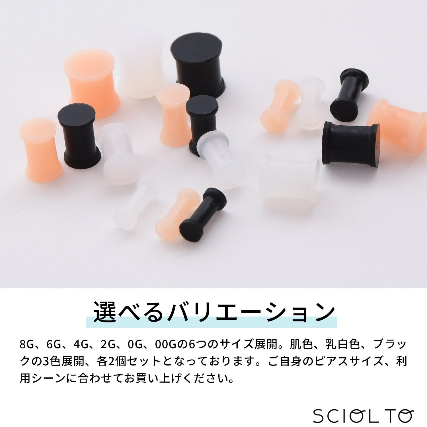 8G、6G、4G、2G、0G、00Gの6つのサイズ展開。肌色、乳白色、ブラックの3色展開、各2個セットとなっております。ご自身のピアスサイズ、利用シーンに合わせてお選びください。
