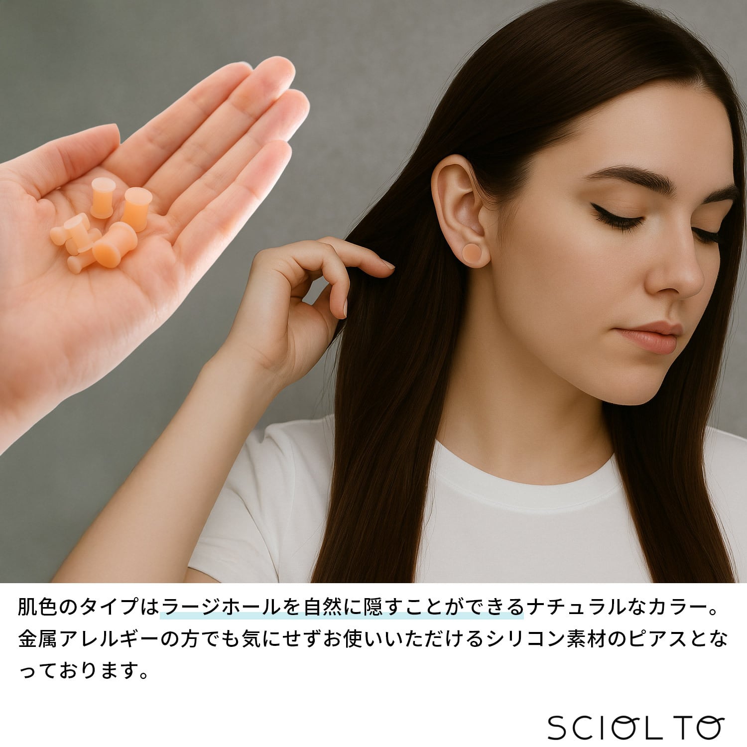 肌色のタイプはラージホールを自然に隠すことができるナチュラルなカラー。金属アレルギーの方でも気にせずお使いいただけるシリコン素材のピアスとなっております。