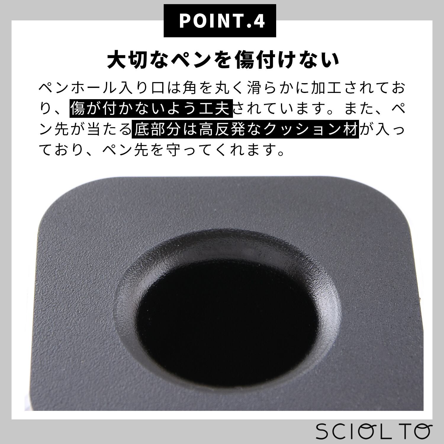 ペンホール入り口は角を丸く滑らかに加工されており、傷がつかないよう工夫されています。また、ペン先が当たる底部分にはこう反発なクッション材が入っており、ペン先を守ってくれます。