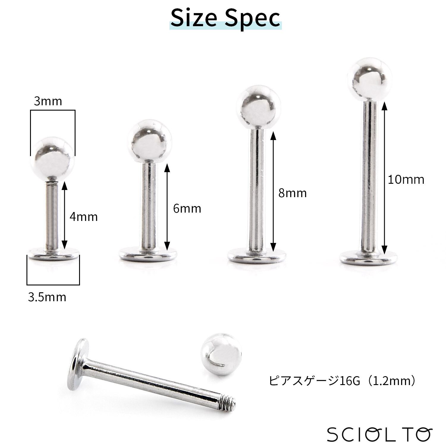 ボール部分:3mm、フラット部分:3.5mm、バーベル部分:4mm、6mm、8mm、10mmの4種類、ピアスゲージ:16G