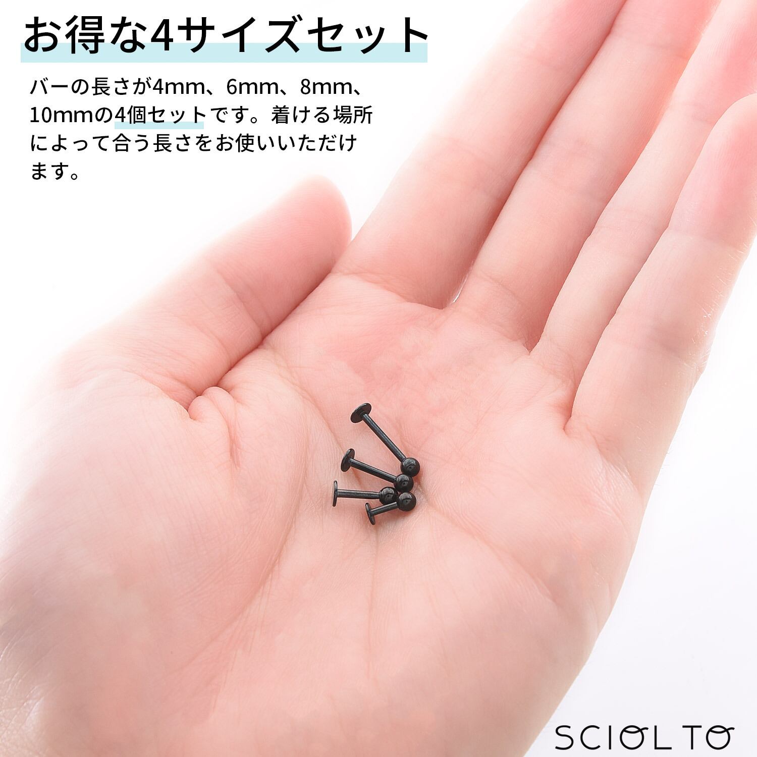 バーの長さが4mm、6mm、8mm、10mmの4個セットです。着ける場所によって合う長さをお使い頂けます。