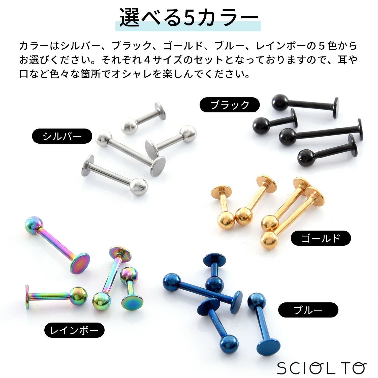 カラーはシルバー、ブラック、ゴールド、レインボーの5色からお選び下さい。それぞれ4サイズのセットとなっておりますので、耳や口など色々な箇所でオシャレを楽しんで下さい。