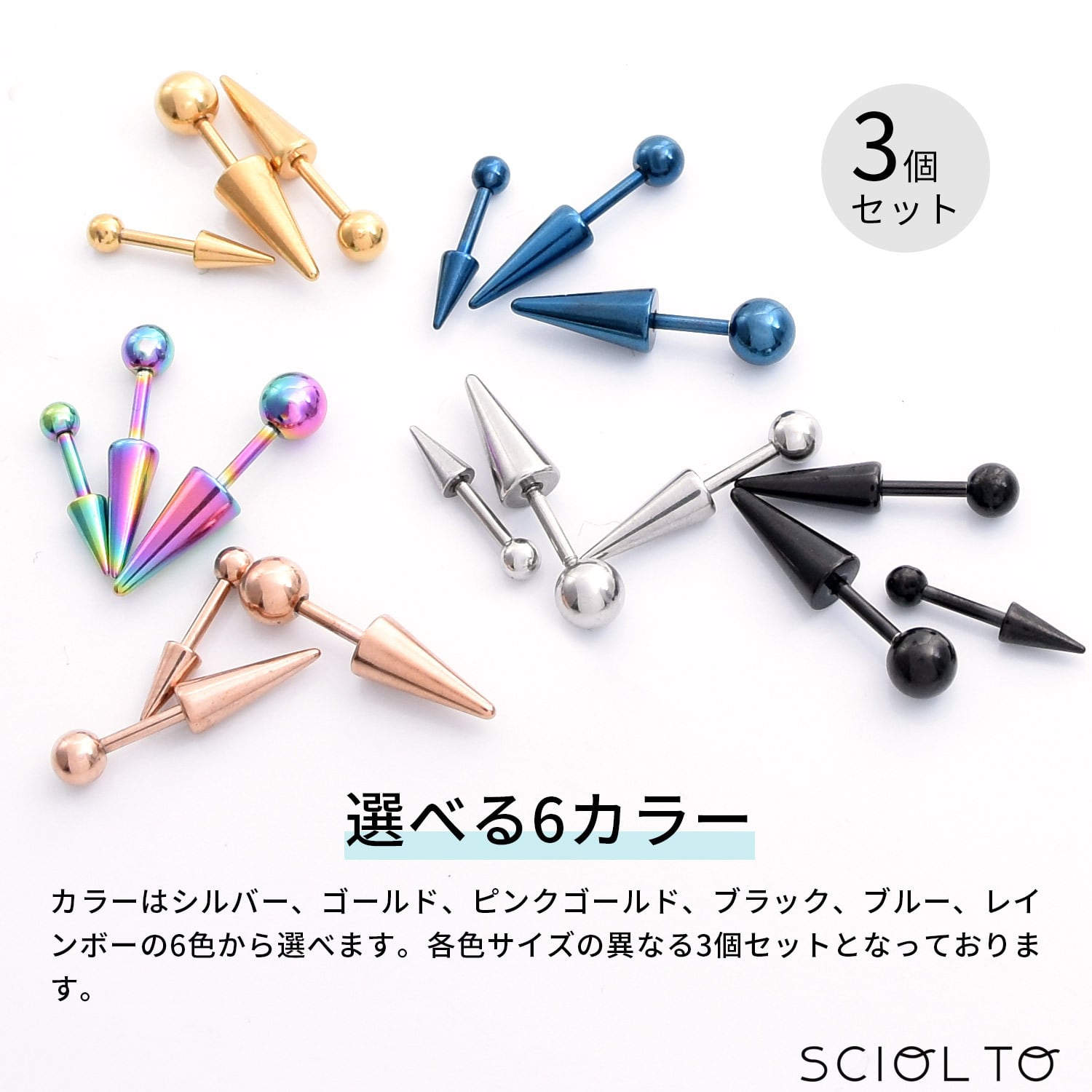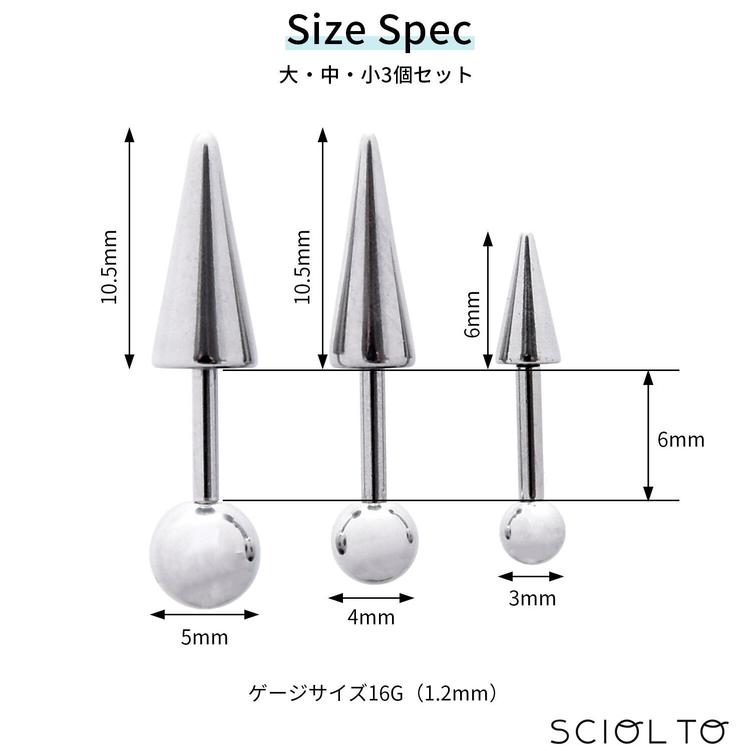 ボディピアス スパイク コーン [16G 3サイズセット] アンテナピアス ステンレス イヤーロブ 耳たぶ ヘリックス 軟骨ピアス メンズ レディース [SCIOLTO(ショルト)]