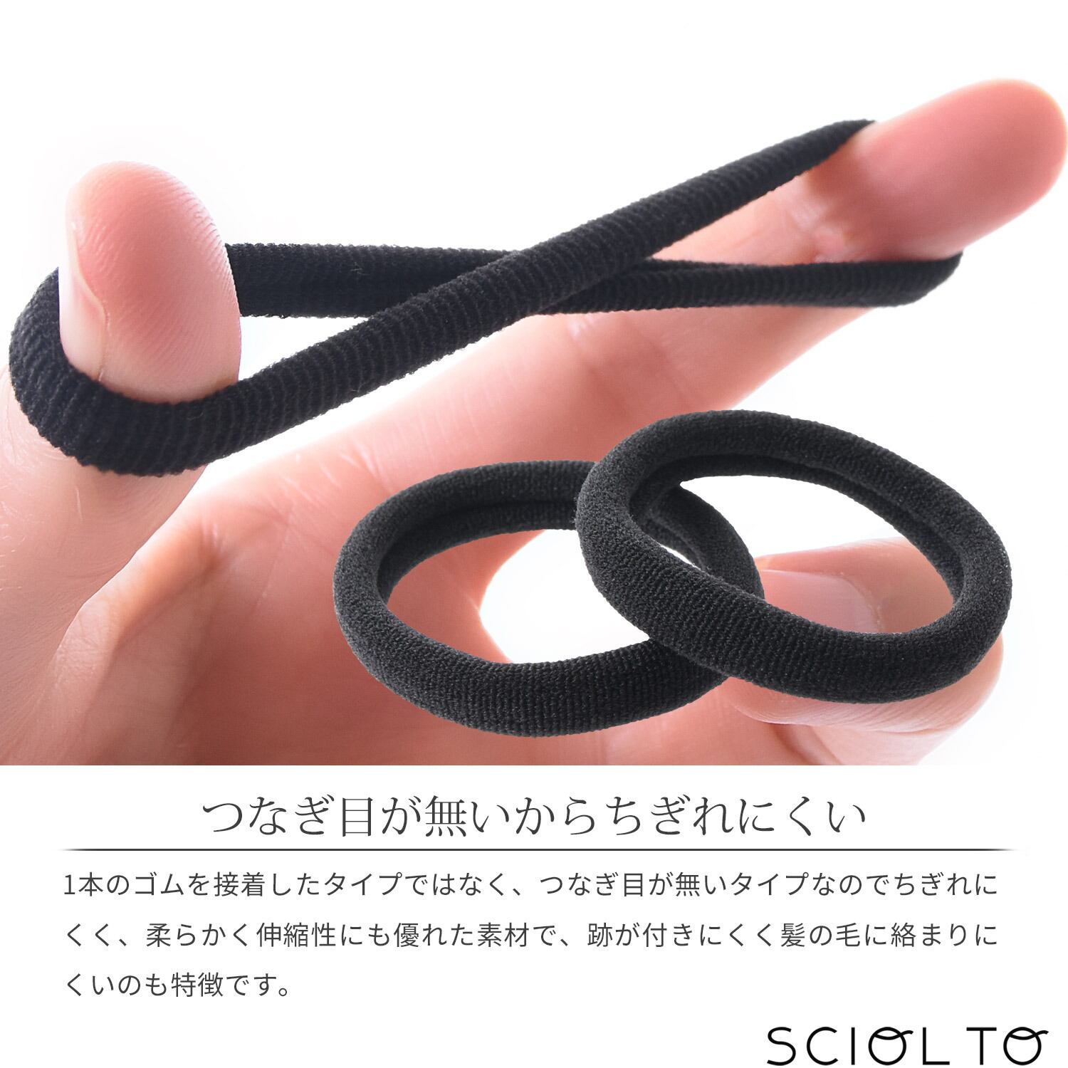1本のゴムを接着したタイプではなく、つなぎ目がないタイプなのでちぎれにくく、柔らかく伸縮性にも優れた素材で、跡が付きにくく髪の毛に絡まりにくいのも特徴です。
