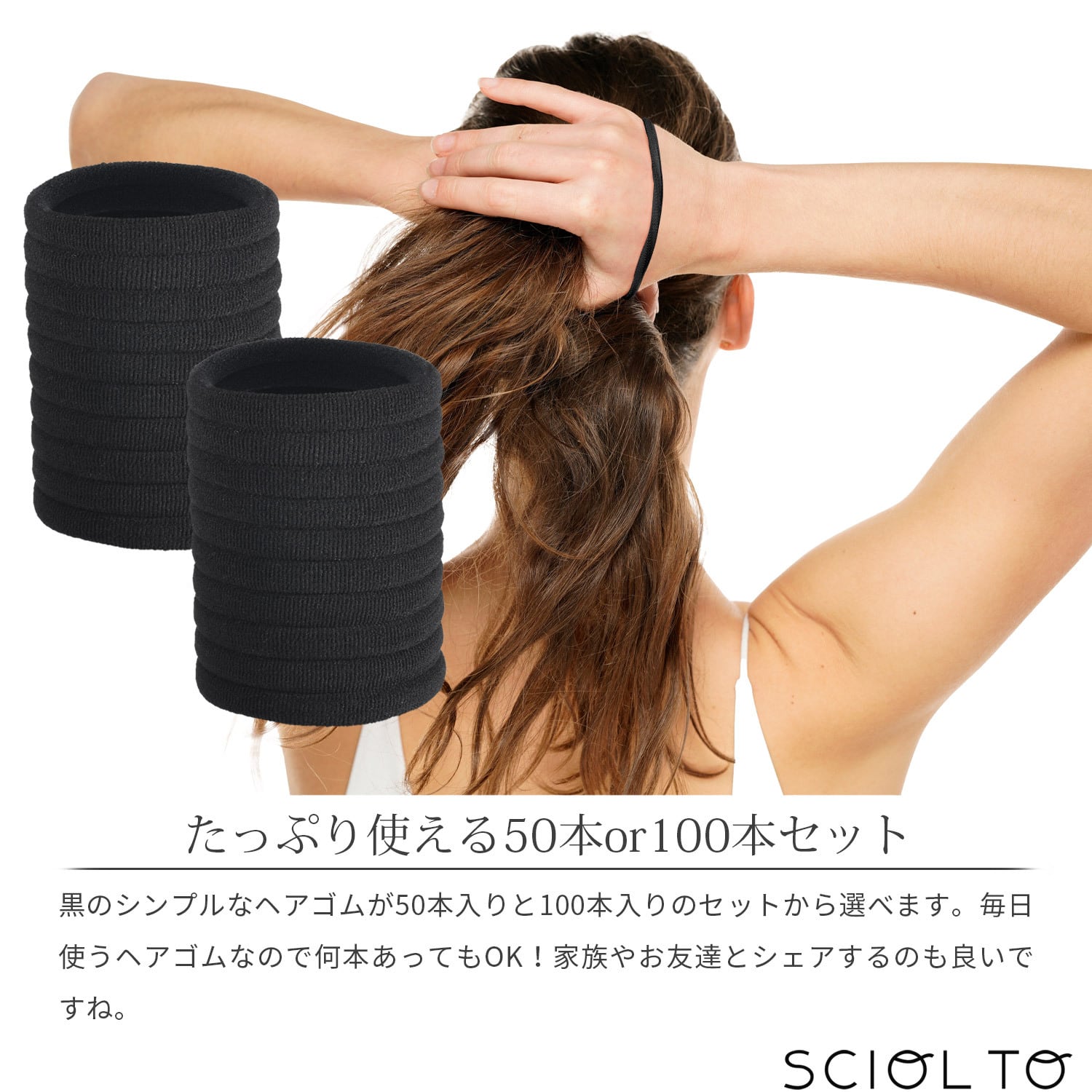 黒のシンプルなヘアゴムが50本入りと100本入りのセットから選べます。毎日使うヘアゴムなので何本あってもOK!家族やお友達とシェアするのも良いですね。