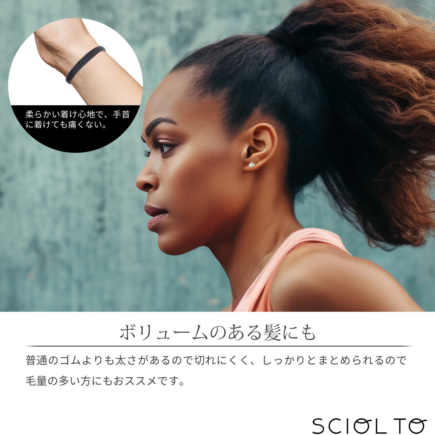 普通のゴムよりも太さがあるので切れにくく、しっかりまとめられるので毛量の多い方にもオススメです。柔らかい着け心地で、手首に着けても痛くない。