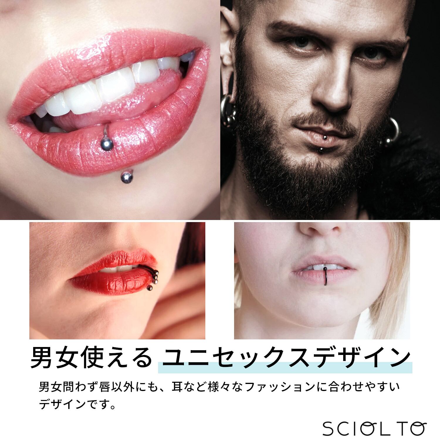 舌ピ、口ピ、ラブレット、リップなど様々な部位に着用出来ます。 もちろん定番の耳たぶ、イヤーロブ、軟骨、トラガス、アンチトラガス、ヘリックス、インナーコンク、アウターコンクの部位にも着用出来ます。 唇に引っ掛けるだけでフェイクピアスとしての使い方もいかがでしょうか?