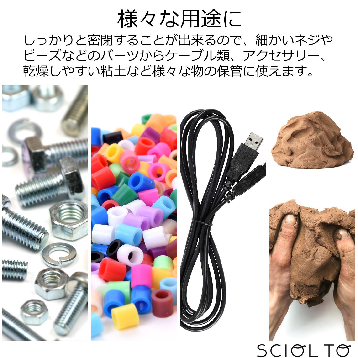 ワンタッチで簡単にしっかり密閉することが出来るので、細かいネジやビーズなどのパーツからケーブル類、アクセサリーまで様々な物の保管にお使い頂けます。